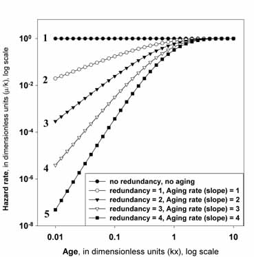 apparent aging rate with increasing levels of system redundancy; (3) the